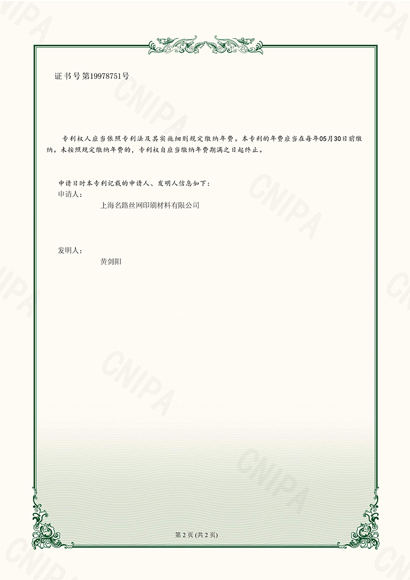 SX9060上海名路丝网印刷材料有限公司实用新型专利证书
